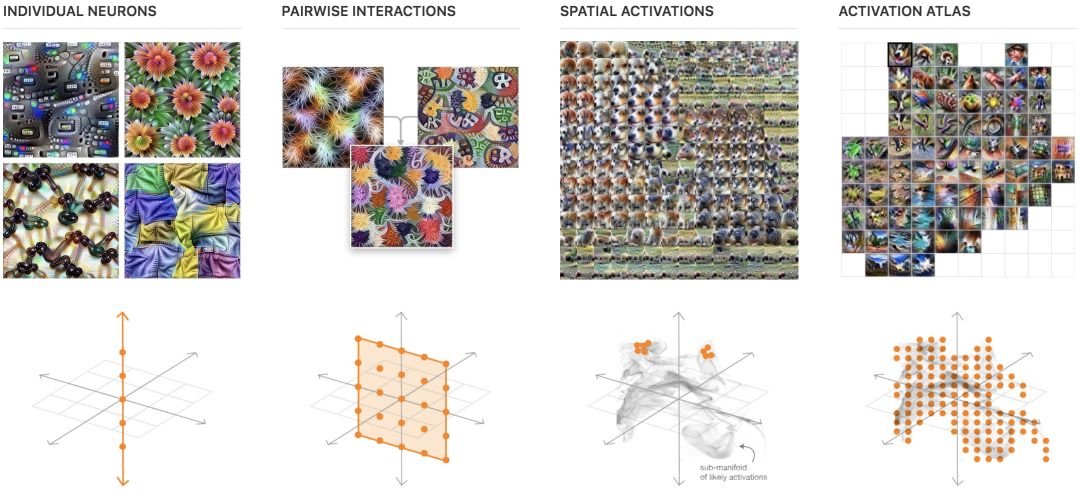 这是一个巨大的进步,但是有一些缺点,因为它没有提供观察整个网络如何运作的能力,因为神经元不是孤立运作。这导致了对神经元之间相互作用的可视化研究。Olah等人通过在两个神经元之间进行添加或插值来演示激活空间的算术性质。