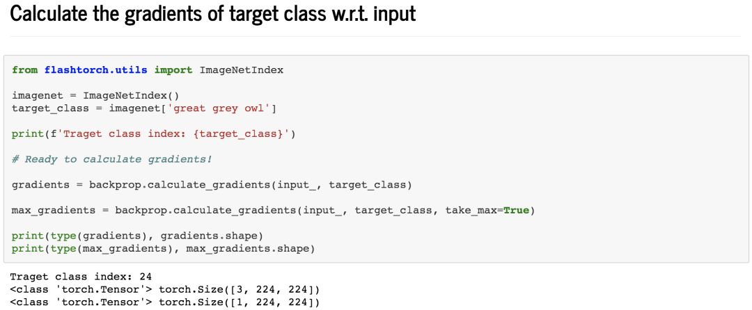 在实例化时,它接收模型Backprop(model)并将自定义钩子注册到网络中感兴趣的层,以便我们可以从计算图中获取中间梯度以进行可视化。由于PyTorch的设计方式,这些中间梯度并不是立即可用的。FlashTorch会帮你整理。