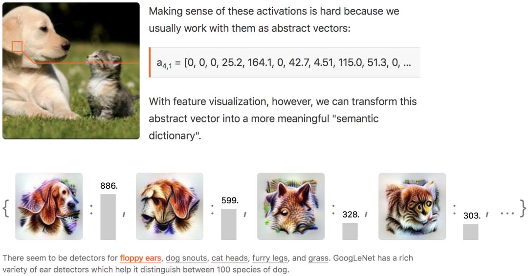然后Olah通过分析在给定特定输入时每个神经元在隐藏层内的贡献,进一步定义了更有意义的可视化单元。观察一组同时被强烈激活的神经元,发现似乎有一组神经元负责捕捉诸如耷拉的耳朵、毛茸茸的腿和草之类的概念。