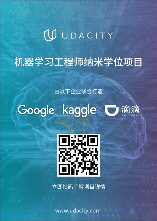 来自硅谷的前沿技术学习平台 Udacity 与 Google 、Kaggle 、滴滴出行 联合推出了“机器学习工程师”纳米学位认证项目,将带你零基础学习硅谷技术课程,全面掌握机器学习所需知识,通过一些列实战项目将预测模型实际应用于金融、医疗、教育等领域,毕业后获得 Google 技术认证证书,成为大数据、人工智能领域的抢手工程师。