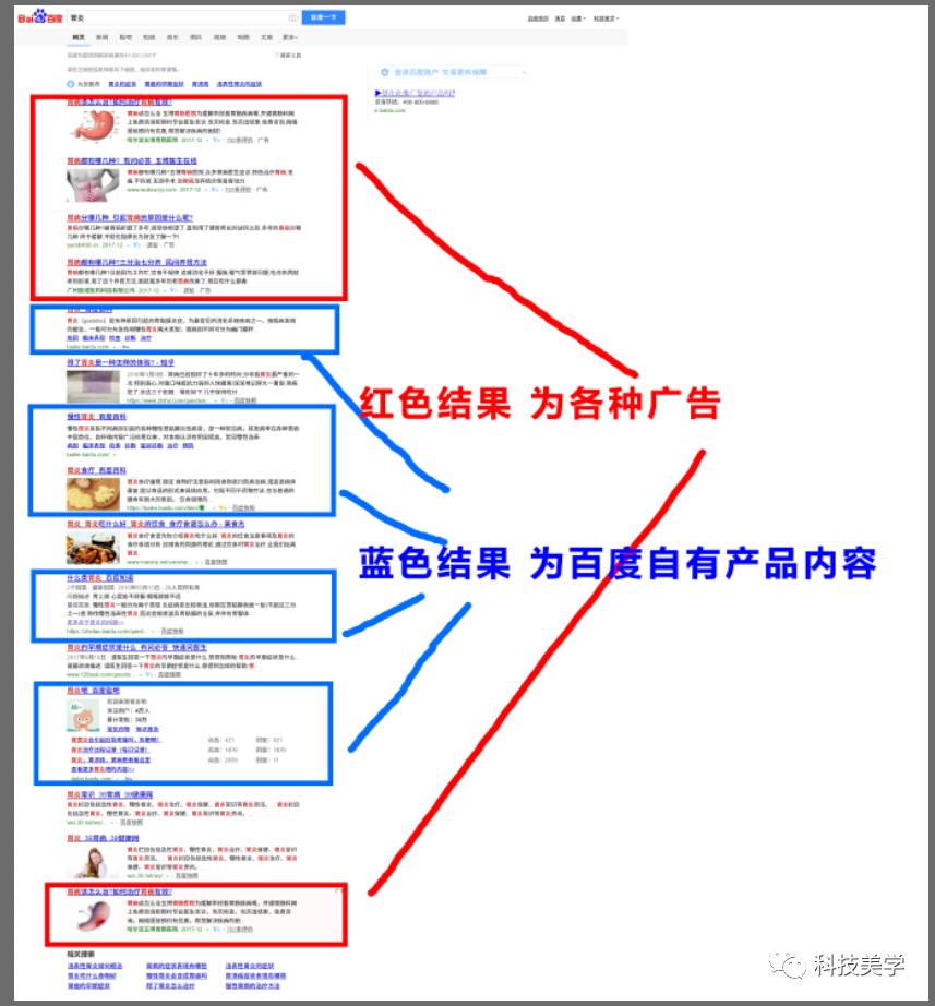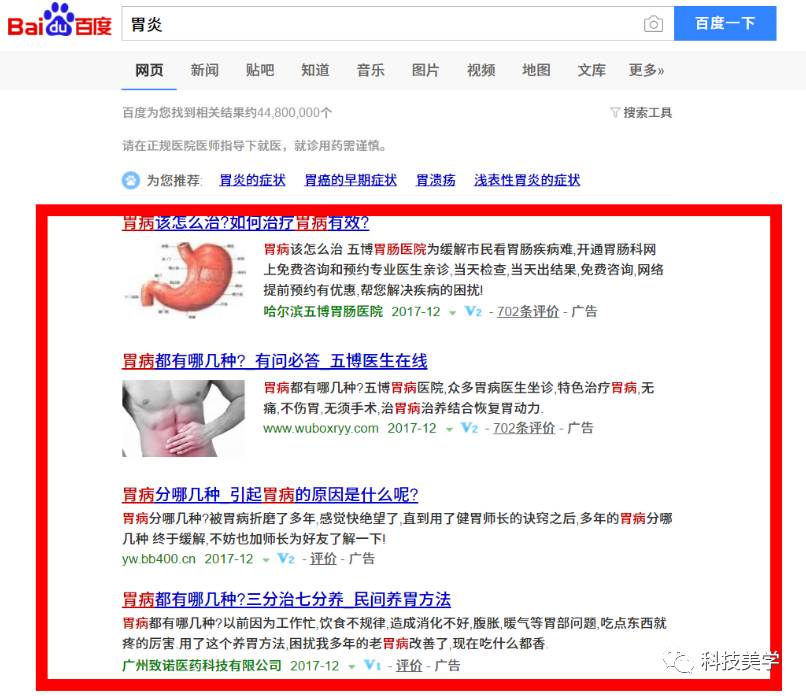 而我们纵观百度首页,搜索“胃病”的所有结果,统计一下,你会发现: