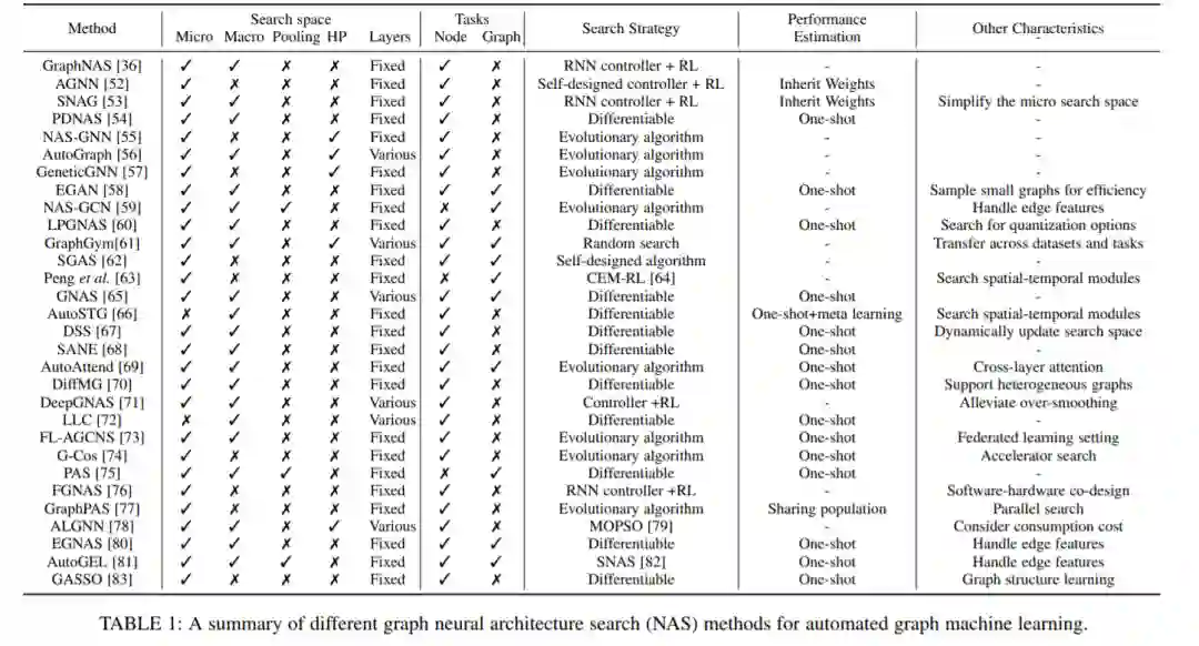 可扩展性: AutoML已经成功地应用于各种图的场景,但在大规模图的可扩展性方面仍有许多值得进一步研究的方向。一方面,虽然文献[39]对大规模图机学习的HPO进行了初步探索,但模型中使用的贝叶斯优化算法效率有限。因此,如何降低计算成本,实现快速超参数优化将是一个有趣且具有挑战性的课题。另一方面,尽管大规模图的应用在现实世界中非常普遍,但NAS用于图机器学习的可扩展性却很少受到研究者的关注,这为进一步的探索留下了很大的空间。