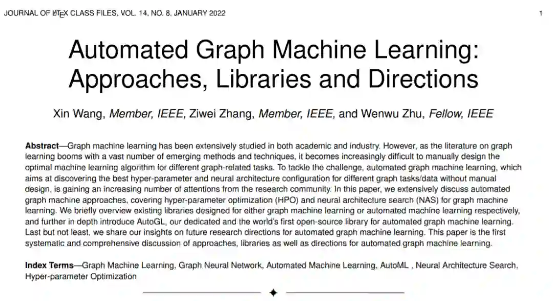 我们特别关注两个主要课题: 图机器学习的HPO和NAS。对于HPO,我们关注的是如何开发可扩展的方法。对于NAS,我们遵循文献,从搜索空间、搜索策略和性能评估策略等方面比较不同的方法。简要介绍了近年来自动化图学习在架构池化、结构学习、加速器和关节软硬件设计等方面所取得的成果。此外,还讨论了如何用不同的方法解决AutoML在图上的挑战。然后,我们回顾了与自动图机器学习相关的库,并讨论了第一个用于自动图机器学习的专用框架和开源库AutoGL。重点介绍了AutoGL的设计原则,并简要介绍了它的使用方法,这些方法都是专门为图上的AutoML而设计的。最后,我们指出了图HPO和图NAS的潜在研究方向,包括但不限于可扩展性、可解释性、分布外泛化、鲁棒性和硬件感知设计等。我们相信本文将极大地促进和进一步促进自动图机器学习在学术界和工业界的研究和应用。