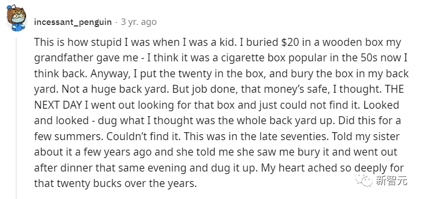 有人讲述了自己童年时候类似的故事。自己将20块零花钱藏在盒子里后埋在自家的院子里,第二天想找的时候却再也找不到了。过了二十年,他把这件事告诉了自己的姐姐,结果姐姐说她那天看到了,所以当晚就把钱挖了出来。