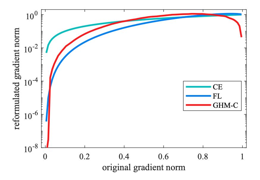 本文提出了梯度密度,并将梯度密度的倒数作为损失函数的权重分别引入到分类损失函数(GHM-C)和边框损失函数(GHM-R)。