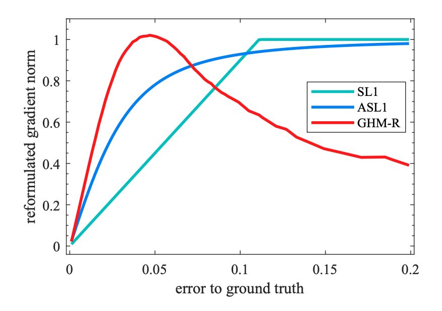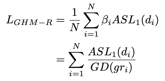 本文修改了损失函数,梯度密度中的梯度模长是基于修改后的损失函数 ASL1 的导数进行计算的,GHM-R 公式如下: