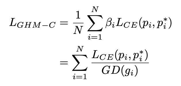 对于分类损失函数,这里采用的是交叉熵函数,梯度密度中的梯度模长是基于交叉熵函数的导数进行计算的,GHM-C 公式如下: