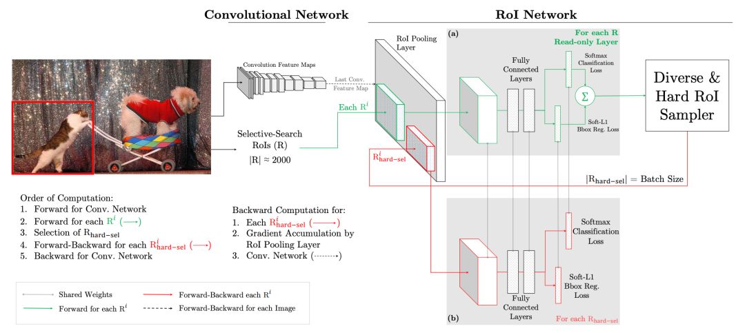 在实际操作中是将原来的一个 ROI Network 扩充为两个 ROI Network,这两个 ROI Network 共享参数。其中前面一个 ROI Network 只有前向操作,主要用于计算损失;后面一个 ROI Network 包括前向和后向操作,以 hard example 作为输入,计算损失并回传梯度。该算法在目标检测框架中被大量使用,如 Fast RCNN。