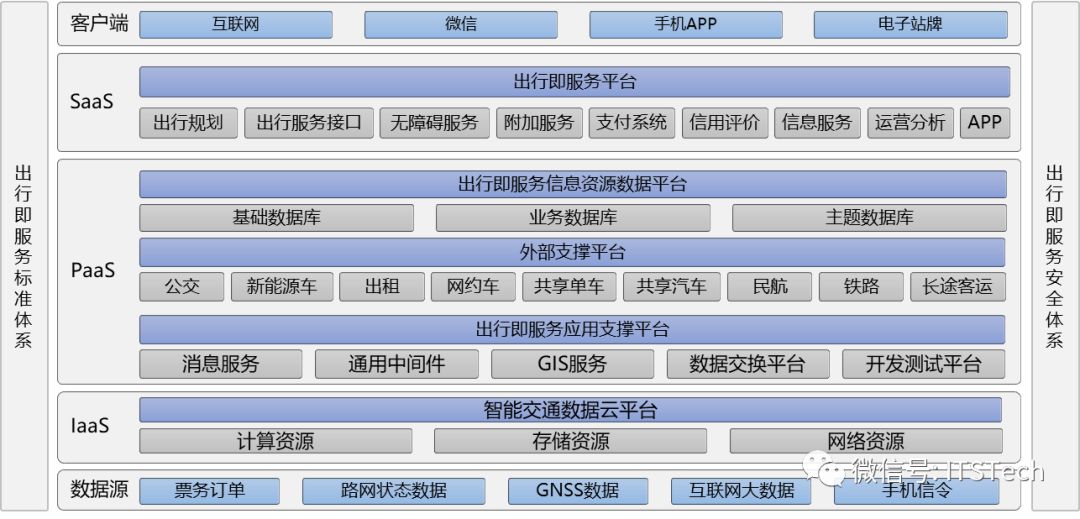 SaaS应用层包括出行规划、出行服务接口、无障碍服务、附加服务、支付系统、信用评价、信息服务、运营分析、手机APP等多个应用系统。