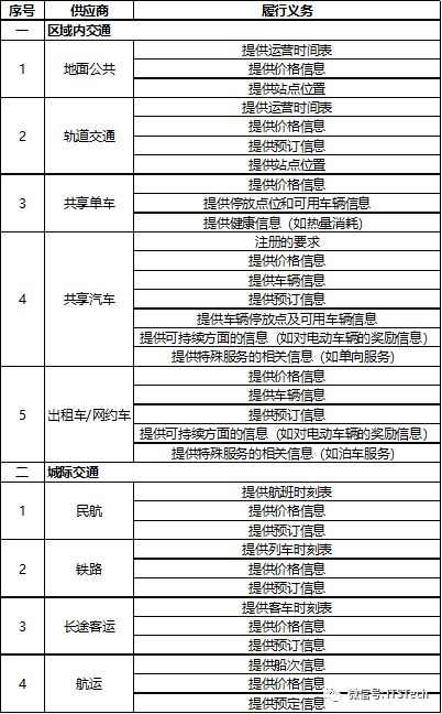 出行即服务平台的高度一体化需要城市及城际所有运输服务供应商之间的合作来实现,其中城市运输包含了地面公交,轨道运输,出租车/网约车、共享单车,共享汽车;城际运输包含了民航,铁路及长途客运等。为了使得出行实现无缝衔接,各个模式的交通服务供应商需要和出行即服务平台签订合同,在能提供出行服务的同时提供相关资料。