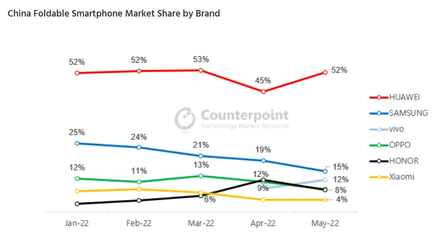 但在这一块市场上,新入局的 OV 竞争力与华为还有较大差距。据 Counterpoint Research 数据,2022 年 1 月至 5 月期间,OPPO、vivo 在中国折叠屏手机的份额仅有 10% 左右,五成左右份额被华为占据。