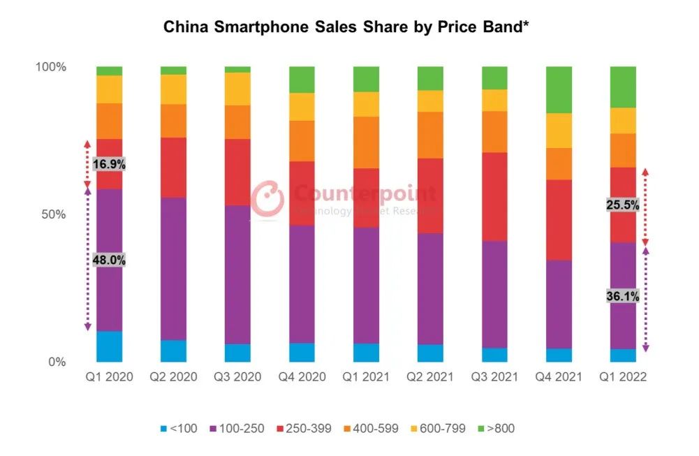 数据显示,随着近几年来手机市场的消费升级,中国市场上高端手机的占比有所提高。中外品牌都想方设法,挤占这块市场的制高点。