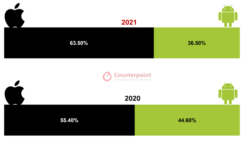 2021 年全年,苹果在中国高端手机市场中占得 63.5% 的份额,比去年的 55.4% 还要高出近 8 个百分点。