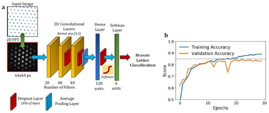 近年来,(扫描)透射电子显微镜((S)TEM)的进步使得人们能够在多个固态过程中观察到原子动力学对电子束辐射的响应。之前,要了解电子束照射下的相转换需要实时绘制结构相及其演变,需要靠手动尝试逐帧分析,不仅困难重重,还耗时费力、单调乏味、极易出错。美国橡树岭国家实验室的Rama Vasudevan等,受计算机视觉启发,猜测神经网络可能有所助益。他们采用深层卷积神经网络(DCNN)计算,自动确定在原子分辨图像中存在的布拉维晶格对称性。在给定输入图像的2D快速傅立叶变换情况下,对DCNN进行训练,识别出布拉维晶格类别;另外采用蒙特卡洛分析来确定预测概率和统计偏差,以展示(S)TEM的模拟图像和真实原子分辨图像的比较结果,他们发现该网络正确而快速地预测了晶格。然后,他们将训练好的网络应用于研究电子轰击下的WS2结构,发现在此过程中其菱形结构消失,与实际观察的数据一致。可见,这种神经网络有可能是分析实时电子显微镜数据用于材料优化和设计的强大工具。