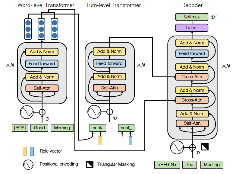 不同于一般的 Transformer Decoder, 在 HMNet Decoder 中,每一个 Block 块会有两个 Cross-Attention 层,先对 Word-level 信息做 Attention,再对 Turn-level 信息做 Attention,以此去融合整个对话的信息。