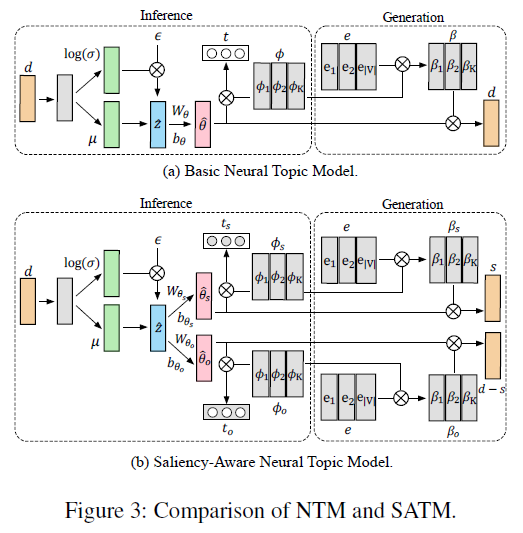 论文则改进了神经主题模型,如上图(b)所示,使其能区分有价值主题和无意义主题。上面那条通路是去重构参考摘要中的词 s,对应有价值主题;下面的通路是去重构对话内容中除开参考摘要的词 d-s,对应无意义主题。这也使得改进后的神经主题模型变成了一个有监督的学习过程。