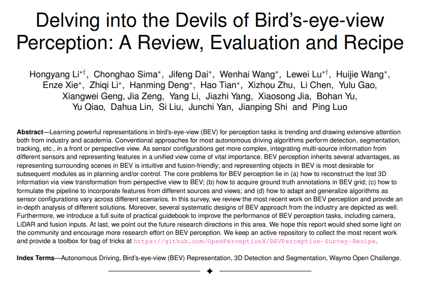 上海AI实验室与商汤等最新《鸟瞰图视觉感知》综述,26页pdf阐述BEV最新方法与评价。