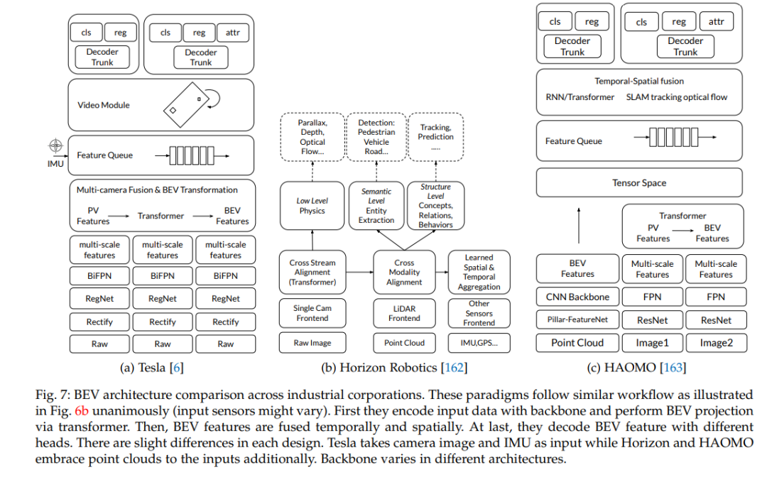 基于以上三个方面的讨论,总结出BEV感知研究具有巨大的潜在影响,值得学术界和产业界长期关注并投入大量精力。与最近关于三维物体检测的研究[19,20,21,22,23]相比,我们的研究不仅在更高的层次上总结了最近的BEV感知算法,并将其形成了一个通用的管道,而且在这种背景下提供了有用的方法,包括基于摄像机和基于LiDAR设置的可靠数据增强、高效的BEV编码器设计、感知头和损失函数族、有用的测试时间增强(TTA)和集成策略等。我们希望这个调研可以成为一个好的起点,为新初学者和当前的研究人员在这个社区有深刻的讨论。