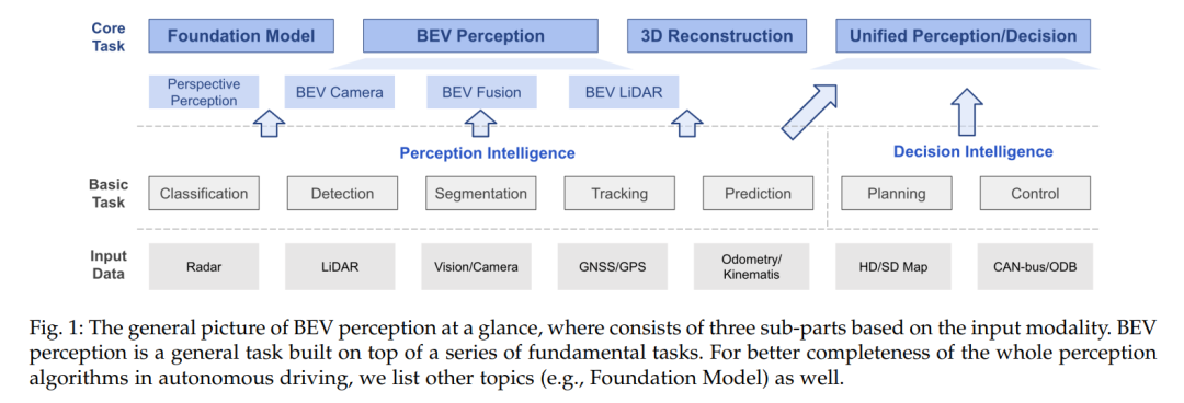 在本研究中,我们将BEV Perception一词用于自动驾驶车辆的BEV视图表示的所有视觉算法。请注意,我们并不打算夸大BEV的概念作为一个新的研究概念;相反,如何在BEV视图下制定新的管道或框架,更好地融合来自多个传感器输入的特征,值得社会各界更多的关注。