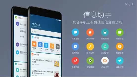 MIUI9信息助手是升级版个人智能助理,MIUI9信息助手聚合了不同应用中的同类别信息,包括收藏、支出、快递、行程、日程等等,不用打开应用查找和整理信息,将手机滑动到桌面最左屏(也称“负一屏”),就可以一步直达。