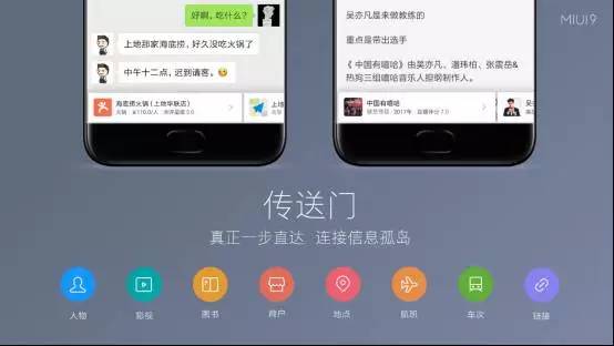 目前,MIUI9系统传送门功能已经支持人物百科、影视剧、书籍、商户、地理位置、链接及特殊链接预览、火车和飞机航班信息等多维度信息查询和推荐。