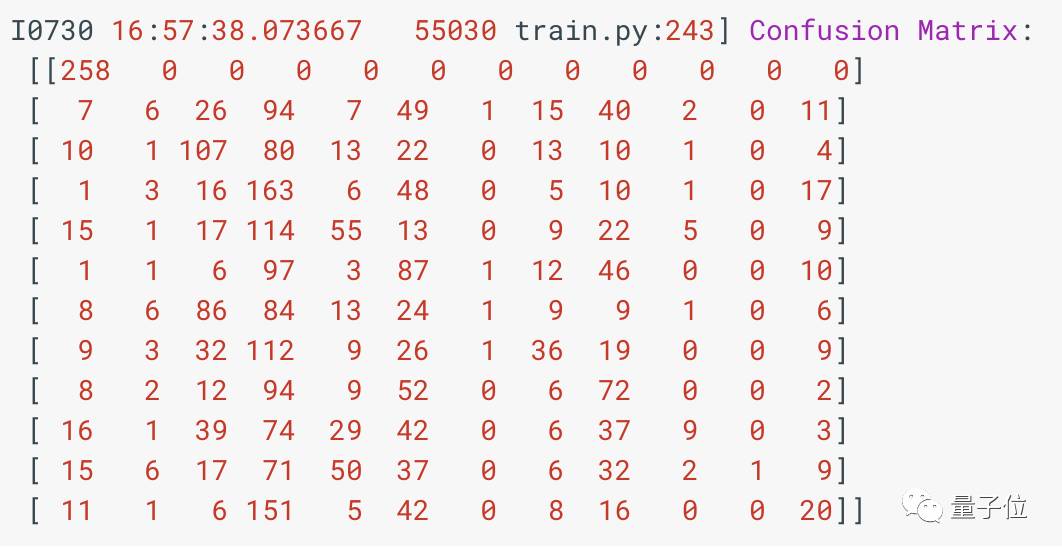 脚本训练完18000步之后,会显示一份最终的混淆矩阵和一个根据测试集得出的准确率得分。如果你按照默认设置进行训练,准确率应该在80%到90%之间。