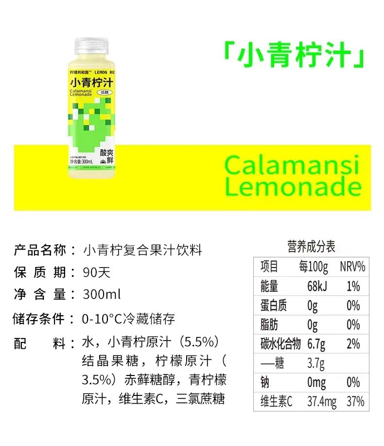 为了顺应近年来饮品市场的“低糖”趋势,并打出自己的口味标签,柠檬共和国将糖酸比例调成了市场口味的80%,并采用了代糖和柠檬汁的新配方。Simon介绍,这款“低糖版”柠檬汁的含糖量只有正常饮料的1/3~1/4。