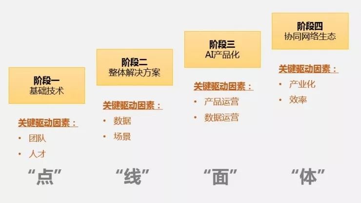 上文提出的AI企业成熟度模型,正是一家企业从技术情怀及崇拜出发、逐渐演变为伟大AI产品公司的路径,四个阶段实际上就是一个从“点”到“线”到“面”最终到“体”的演进过程。