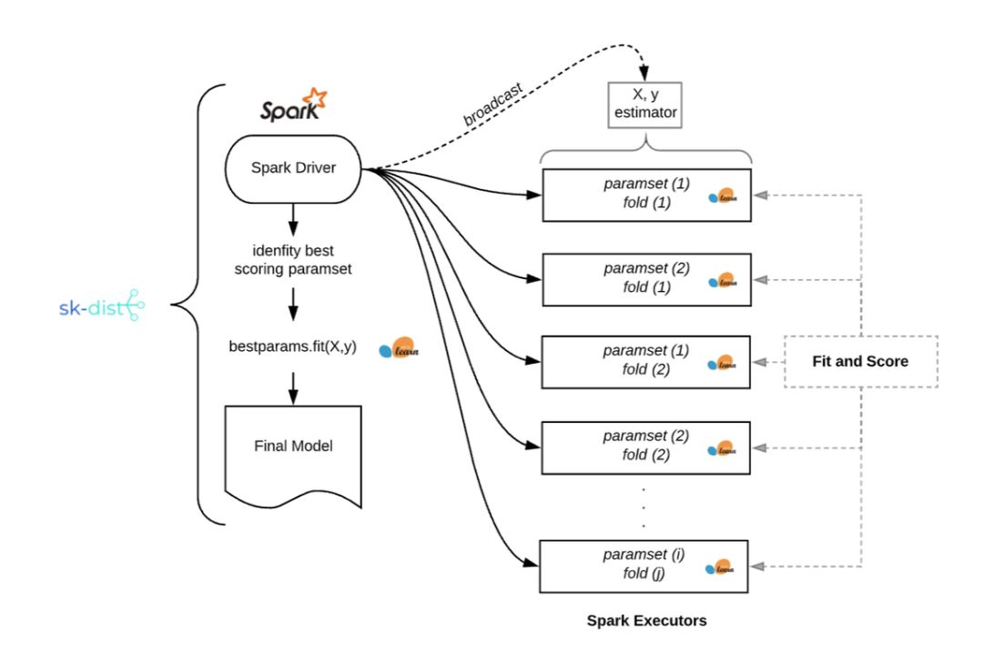 该示例说明了一个常见情况,其中将数据拟合到内存中并训练单个分类器并不重要,但超参数调整所需的拟合数量很快就会增加。以下是运行网格搜索问题的内在机制,如上例中的 sk-dist: