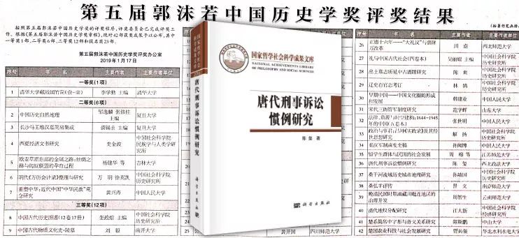 日前,第五届郭沫若中国历史学奖评选结果公布,科学出版社出版的《唐代刑事诉讼惯例研究》(陈玺著. 北京:科学出版社,2017.3)一书荣获提名奖。设立于1998年的“郭沫若中国历史学奖”是目前中国历史学界的权威荣誉奖项。本书也入选2016年国家哲学社会科学成果文库,荣获方德法治研究二等奖、西安市第十次哲学社会科学优秀成果奖一等奖。