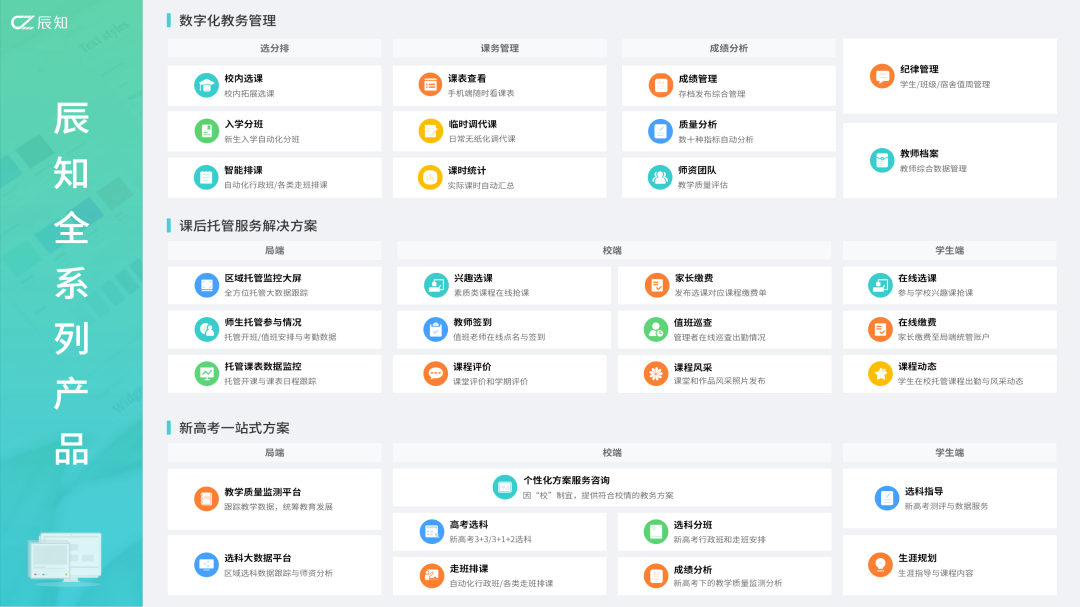 辰知科技作为新高改背景下成立的校园信息化SaaS解决方案服务商,以教务管理和新高考为切入点,面向区域局和大型学校提供各类场景的解决方案,如选课、分班排课、考试安排、课后延时服务等。