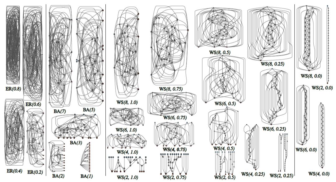 --ER: N个节点,节点两两之间以P的概率有一条边。该方法包含一个参数P,故以ER(P)表示。