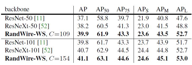 论文将RandWireNN作为骨干网络,用Faster R-CNN with FPN来检测目标(COCO object detection),如表4所示,比ResNet-50和ResNeXt-50效果好。