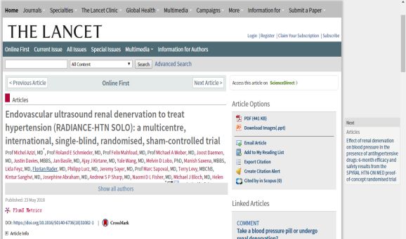 尽管还需要进一步的更大规模的临床试验来证实这项技术的有效性和安全性,但我们仍然希望他们能够促成“去肾脏神经手术”作为需要终生使用降血压药物来控制血压的高血压患者的替代治疗方案。“