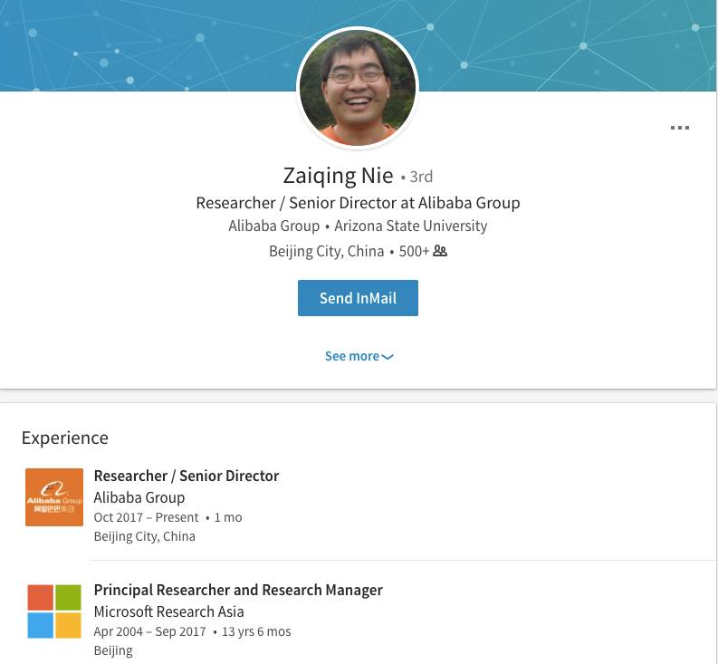 从他们的领英账户看来,二人履历均很简单。其中聂再清从清华大学本科及硕士毕业后,于 1999 年来到亚利桑那州立大学读博士,后于 2004 年博士毕业后加入微软亚洲研究院工作至今。近日,已近不惑之年的他在领英主页新增就职阿里的信息,职位为研究员、高级总监。