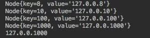 可见最终会按照 key 的大小进行排序,同时传入 hashcode = 101 时会按照顺时针找到 hashcode = 1000 这个节点进行返回。