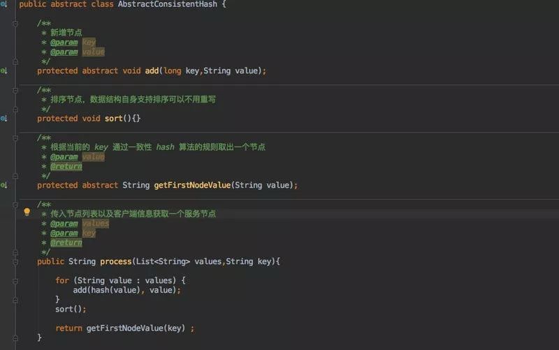 在应用的时候考虑到就算是一致性 hash 算法都有多种实现,为了方便其使用者扩展自己的一致性 hash 算法因此我定义了一个抽象类;其中定义了一些模板方法,这样大家只需要在子类中进行不同的实现即可完成自己的算法。