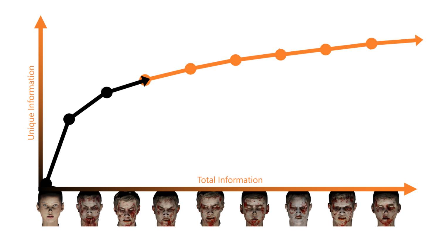 它采用的理念是,当我们看到第一个僵尸图片时,其中的图像信息对于我们而言都是全新的;之后当遇到第二个和第三个僵尸时,基于我们已有的信息,我们便会发现更多复杂的细节,以及越来越少的新特点。