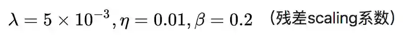 1. 对残差信息进行 scaling,即将残差信息乘以一个 0 到 1 之间的数,用于防止不稳定;