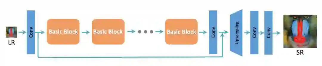 首先,作者参考 SRResNet 结构作为整体的网络结构,SRResNet 的基本结构如下: