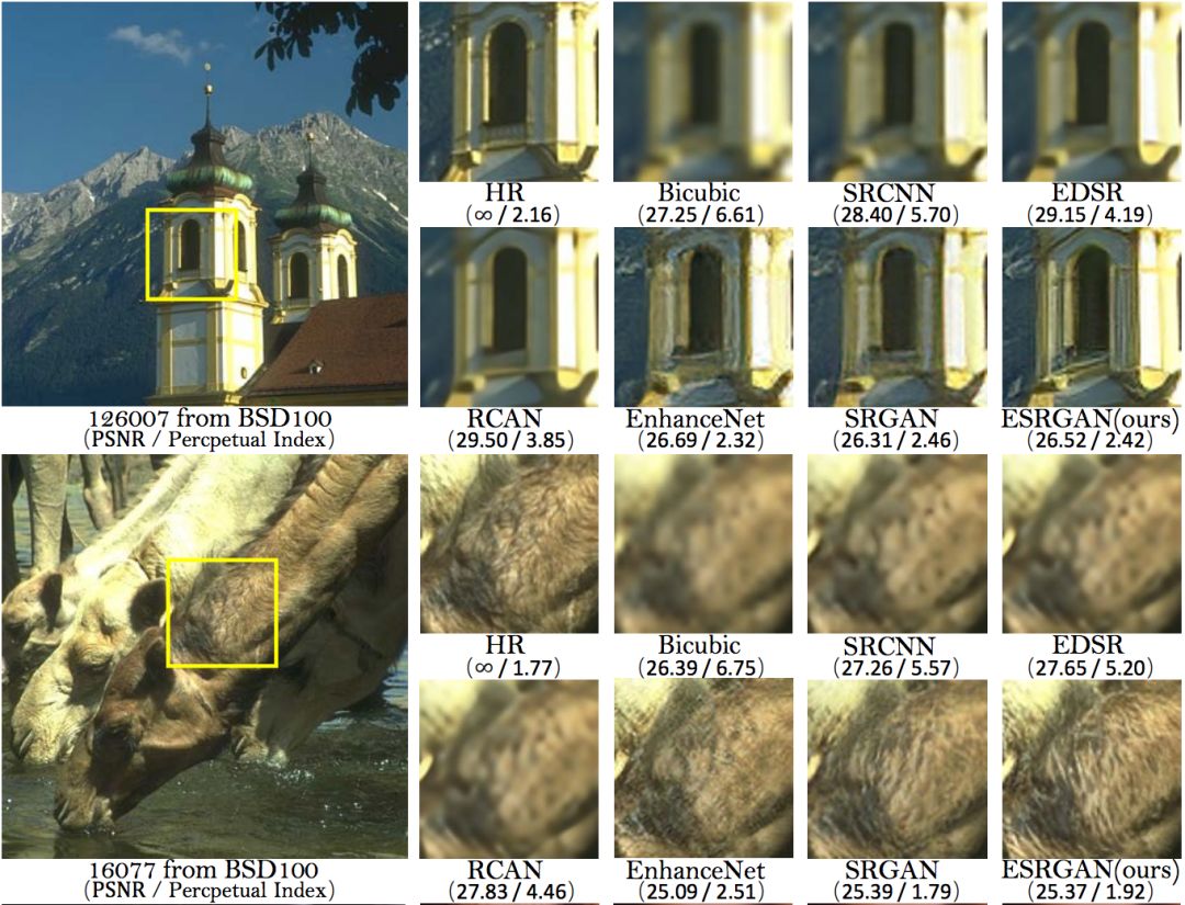 可以看到,ESRGAN 得到的图像 PSNR 值不高,但是从视觉效果上看会更好,Percpetual Index 值更小(越小越好),而且 ESRGAN 在 PIRM-SR 竞赛上也获得了第一名(在 Percpetual Index 指标上)。