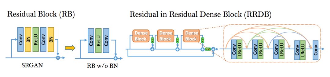 2. 把原始的 block 变为 Residual-in-Residual Dense Block (RRDB),这个 block 结合了多层的残差网络和密集连接。