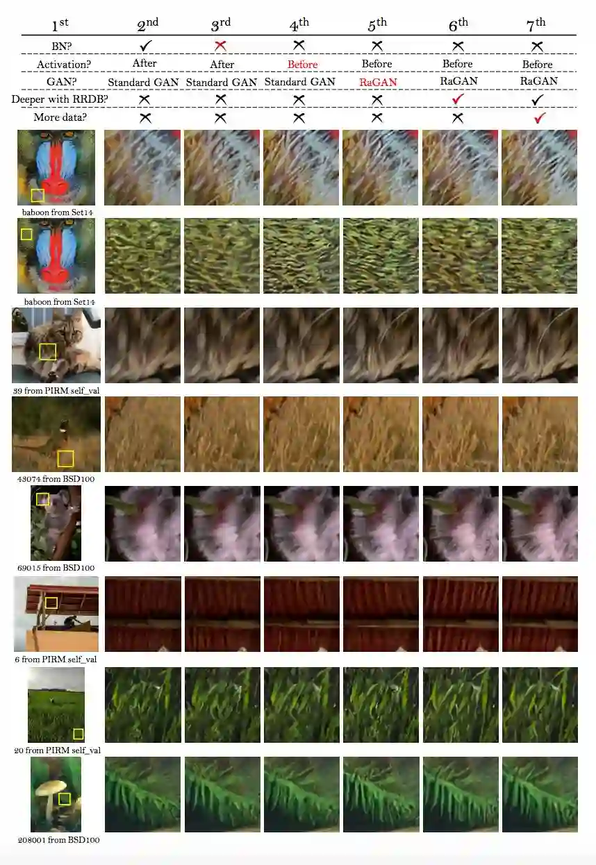 针对文中提到的各种改进,包括移除 BN,使用激活前特征作为感知域特征,修改 GAN 的判别条件,以及提出的 RDDB,作者做了详细的对比试验,结果如下: