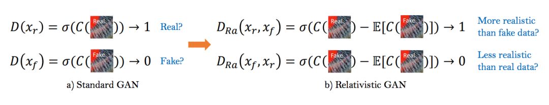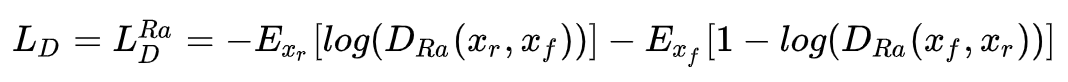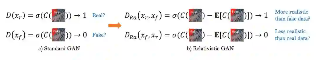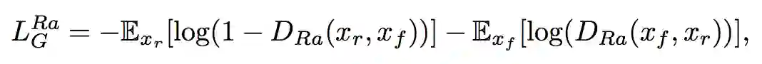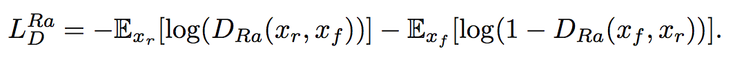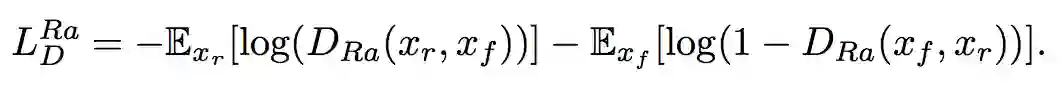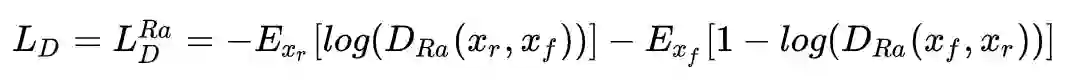 具体而言,作者把标准的判别器换成 Relativistic average Discriminator(RaD),所以判别器的损失函数定义为:
