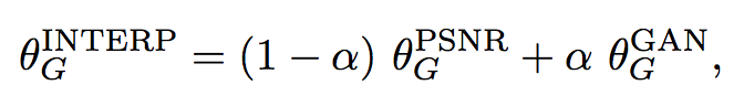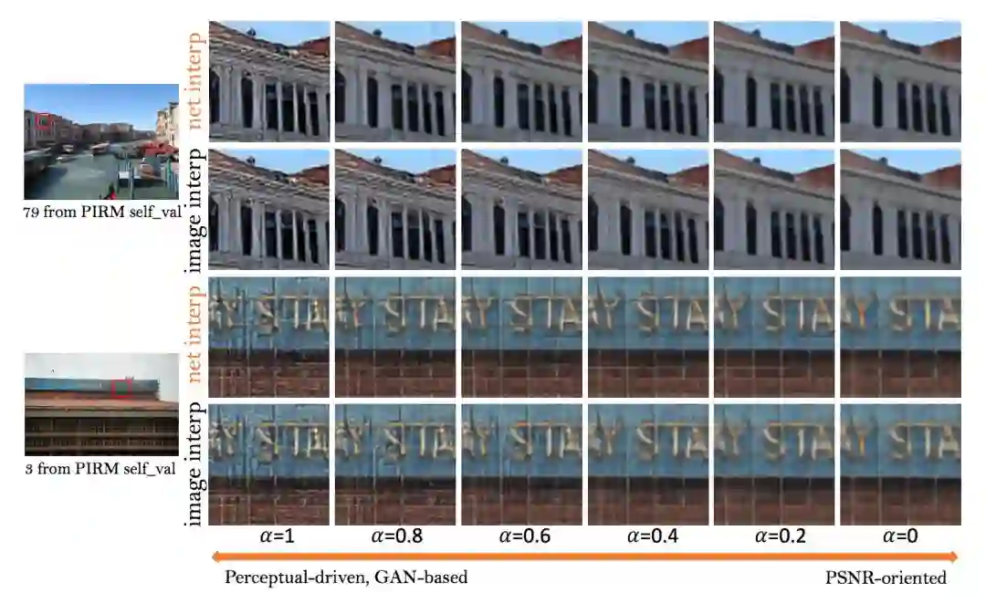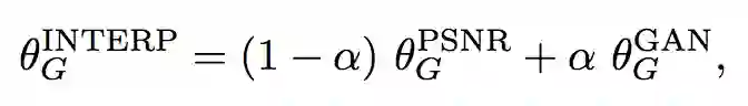 为了平衡感知质量和 PSNR 等评价值,作者提出了一个灵活且有效的方法——网络插值。具体而言,作者首先基于 PSNR 方法训练的得到的网络 G_PSNR,然后再用基于 GAN 的网络 G_GAN 进行 finetune。