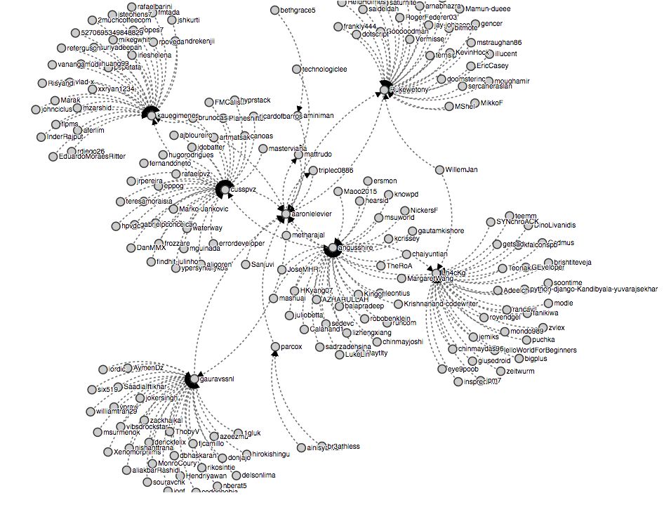 这是我做的一个项目的demo,用的是Neo4j、D3hs和Python 多线程表示的GitHub上的关注者,是一个双向图。链接在此:https://github.com/aaronlelevier/neo4j-github-followers