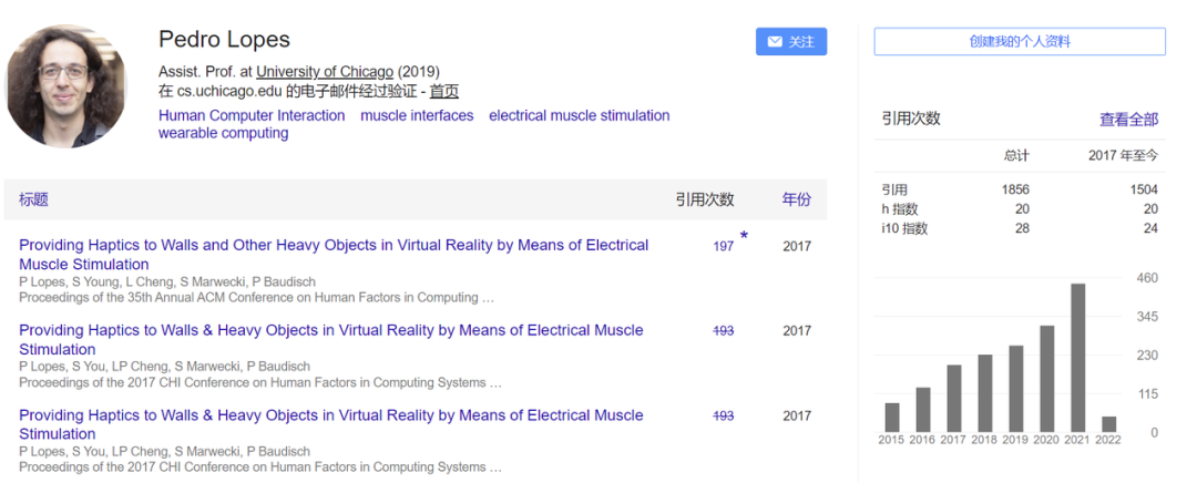 Pedro Lopes,芝加哥大学计算机科学系助理教授。Pedro Lopes 的研究旨在设计直接与用户身体集成的交互式设备,包括可穿戴设备等。Pedro Lopes 的研究通过借用用户身体的一部分作为输入 / 输出硬件,从而使设备不仅非常小,而且还实现了一种新颖的交互模型,让设备直接与用户的身体集成。
