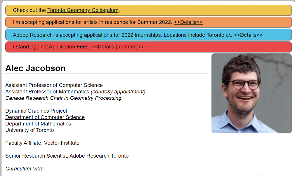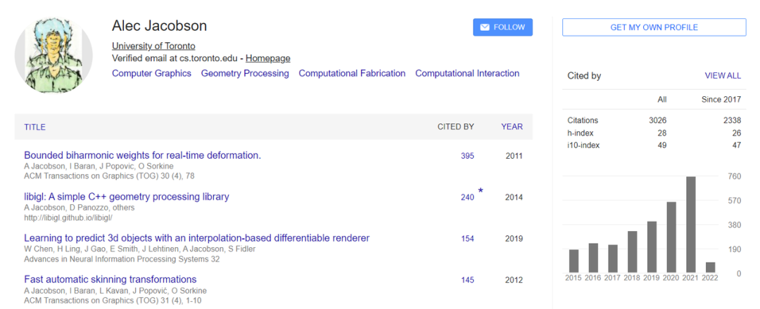 Alec Jacobson,多伦多大学计算机科学和数学系助理教授、Adobe 研究院高级研究科学家,他在苏黎世联邦理工学院获得计算机科学博士学位,师从 Olga Sorkine-Hornung 教授。他的工作涉及几何处理的各个方面,包括二维 / 三维几何的机器学习、基于物理的模拟、计算制造、几何能量和偏微分方程的数值方法,以及二维和三维的交互设计工具。他领导了广泛使用的几何处理库 libigl 的开发,该库获得了 2015 年的 SGP 软件奖。2020 年,他获得了 ACM SIGGRAPH 重要新研究员奖(Significant New Researcher Award)。