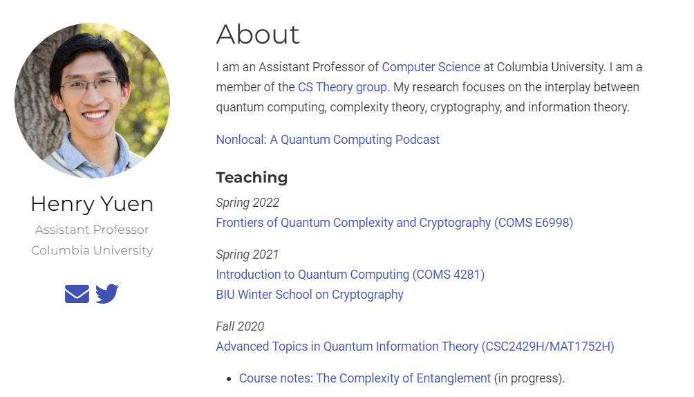 Henry Yuen,哥伦比亚大学计算机科学助理教授,研究兴趣主要集中在量子计算、复杂性理论、密码学和信息理论之间的相互作用等方面。