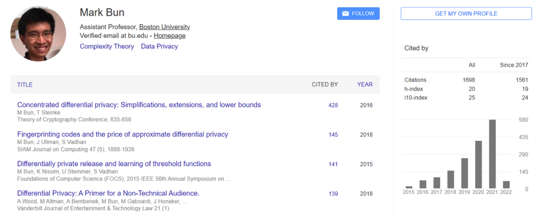 Mark Bun,波士顿大学助理教授,2016 年在哈佛大学取得计算机科学博士学位,师从 Salil Vadhan。他对理论计算机科学有广泛的兴趣,包括数据隐私、计算复杂性、密码学和机器学习基础。